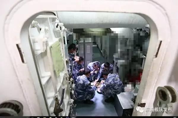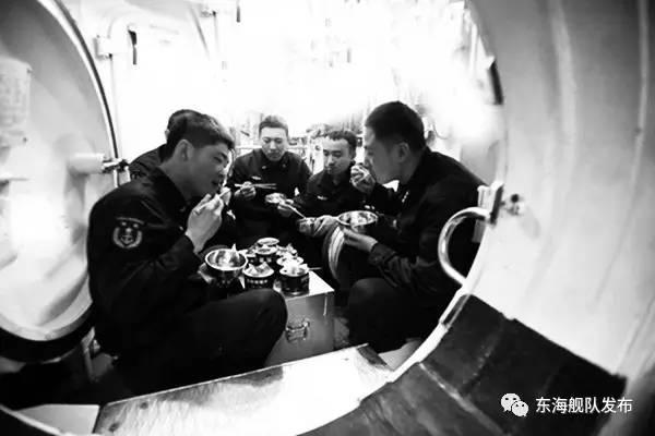 潜艇兵就餐不像岸勤单位或者水面舰艇部队,有专门的餐厅。但他们可以围坐在会议室(手术室),享用海底的“除夕宴”;可以掀开床板,数人一盆面;也可以找个空旷地,一个班席地而坐……