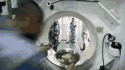 潜艇内部,仪表、阀门、管路密布,只留出窄窄一条通道,上下左右都要留神,梯子相比水面舰艇更为陡峭,水密门呈现出有限大的圆形,仅允许一人通过。这种情况下,传统的“上菜”模式已经无法满足要求。潜艇兵脑洞大开,发明了“接龙”上菜。
