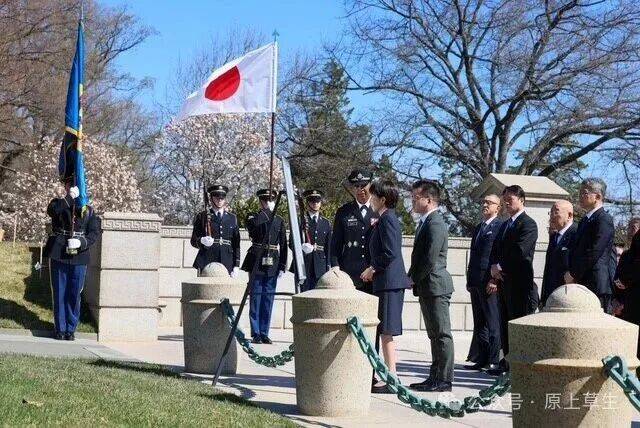 没有美国高官陪同,只有仪仗队和随行人员。她手持红白相间、宛如日本国旗的鲜花,走向无名烈士墓。
