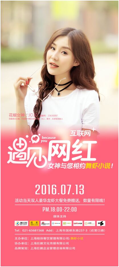 2016年7月13日,中国第一美食主播、知名艺人、花椒女神JOJO与您相约舞虾小说,与您共同品鉴精美龙虾大餐,与您共同邂逅才子佳人,与您共同穿越汉唐盛世!活动当天,腾讯、搜狐、乐视、优酷、爱奇艺、网易娱乐等众多媒体齐齐助阵,更有多位帅哥美女、企业大咖、吃货小伙伴欢聚一堂,更有价值不菲的当代知名书画家作品、价值颇高的国酒茅台及50份双人豪华龙虾大餐等多重惊喜等着您拿哟,记得关注花椒女神花椒号哈:23630097 今晚7点,花椒女神与您花椒开放侃美食文化,不见不散哈!