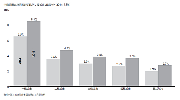 与此同时,网上购物将继续主导中国现代零售环境。在过去四年,中国电子商务市场的年增长率在37%左右,创造了近4万亿元的收入,使中国一跃成为全球最大的电商市场。下线城市的网购消费额占比仍然有限,说明有很大的增长空间。
