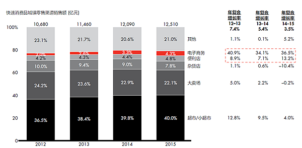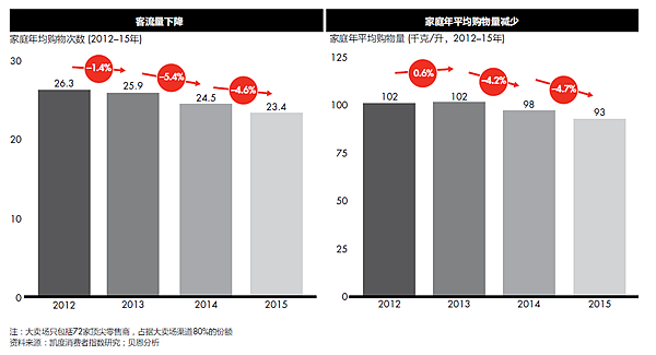 相反地,过去十年重塑中国零售环境的大卖场(面积在6000平米以上),2015年首次出现负增长,在城市快速消费品市场的销售额下跌0.2%,客流减少4.6%,家庭年平均购物量下降4.7%。超市/小超市(面积在100-6000平方米)的增长也颇为乏力,增速从去年的9.5%放慢到今年的4%。
