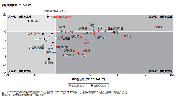 他解释道:“由于很难推动消费者提高购买频率,且很多品类的购买频率很低,各大品牌通常会投资推出高端产品。经实践证明,在渗透率停滞或下降的情况下,这一方法可成功地实现销售增长。”