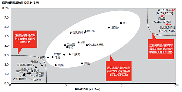 * 口香糖、饮料和衣物柔顺剂品类的电商渠道渗透率较低,而且在过去的四年中,也没有太大增长。这是因为口香糖属于冲动型消费品类,饮料的最后一公里运送成本通常较高,而中国家庭不常购买衣物柔顺剂;